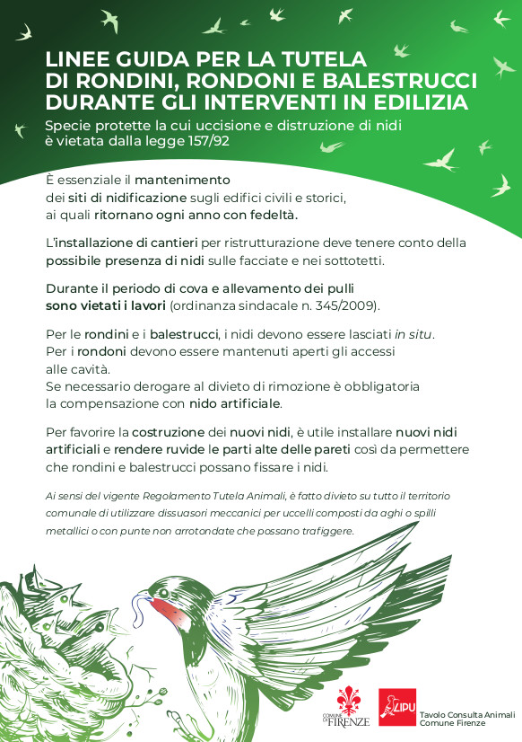 - l’ordinanza n°345 del 2009 del Comune di Firenze che vieta la distruzione dei nidi e obbliga alla compensazione con nidi artificiali sostitutivi.