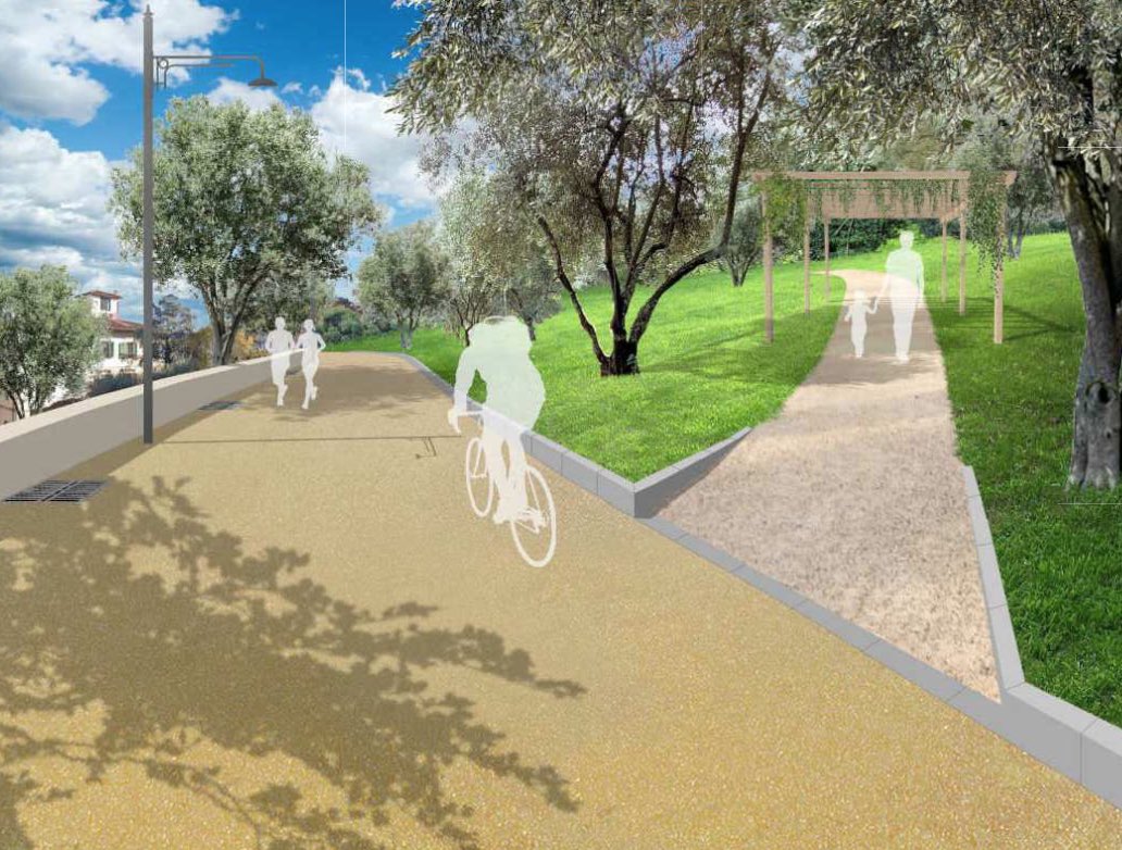 Il progetto prevede inoltre di recuperare il più possibile il disegno dei percorsi attualmente esistenti ed implementarli con nuovi tracciati coerenti con le nuove funzioni di parco cittadino. Tutti i sentieri saranno quindi recuperati con materiale naturale e sistemati per permettere la maggiore fruibilità possibile.
